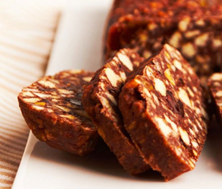 Перед подачей охладить несколько часов в холодильнике и нарезать круглыми кусочками. По желанию в массу из печенья можно добавить половину стакана рубленых орехов и 100 грамм нарезанного чернослива.