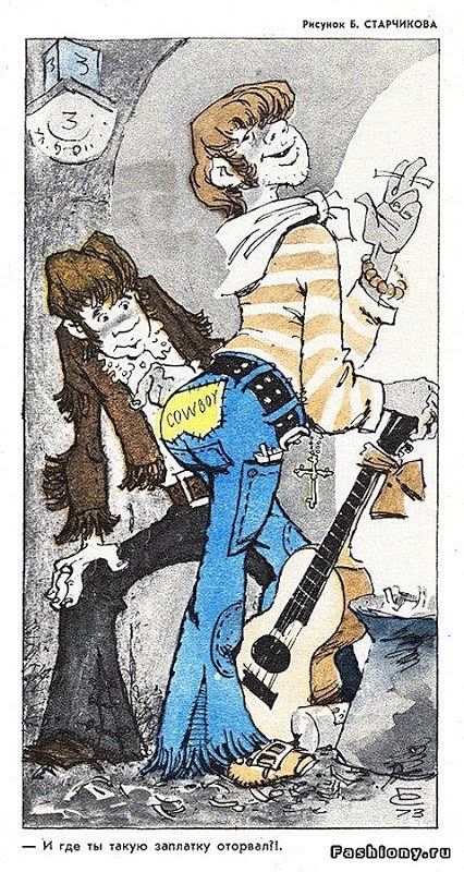Хмммм… Утрировать отдельные проявления моды в зовдэповские времена некогда было популярно. Но! Причём тут «джинсы»? Это же самая универсальная одёжа!!!
