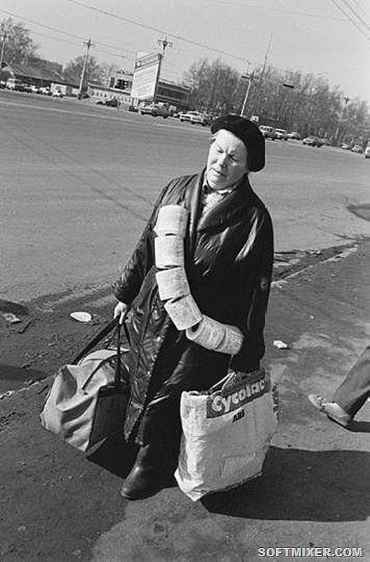Потолок приходится белить зубным порошком, краску “приносят с работы”. Терпят хамство продавцов. Бегают за автобусом с рулонами туалетной бумаги на шее. Стоят за колбасой. Всё как всегда.