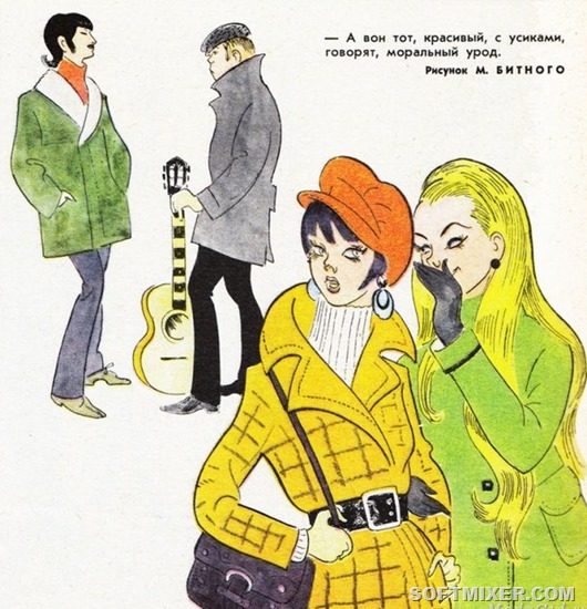 Подростковая мода во все времена была “хулиганской”. Весной 69-го парни носили пальто с устрашающе поднятым воротником и резиновые сапоги с вывернутыми голенищами. Никаких головных уборов: все вокруг должны видеть, какие у тебя замечательно длинные волосы, как дико они лезут на уши и спускаются на нос. Немытость волос прибавляла куражу.