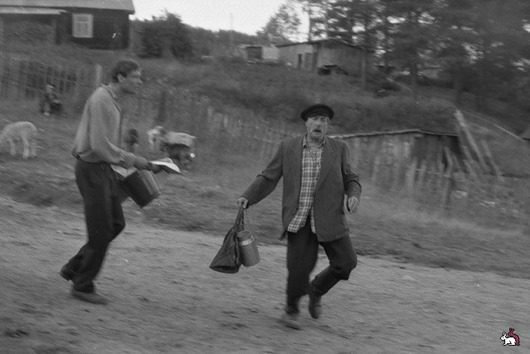 «Мне хотелось холмов каких-то, пригорков — красивее можно организовать сценически. И в Медвежьегорск мы поехали просто потому, что в названии «горск” — может, там гора какая-нибудь есть? Ничего приличного с ходу не нашли. И вдруг, проезжая по улице, которая шла вниз, к реке… Мы спустились и увидели этот дворик. Уже потом договорились с хозяевами, замостили все деревом, как в Сибири.