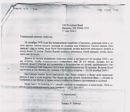 «Руководителю российской спасательной группы. Я — Говард Мур, авиатехник, один из выживших. В 1978 году мне было 23 года. Я жил мечтой — летать. Но случилась беда. Шансов — никаких. Я чувствовал, что скоро погибну от холода. Думал о близких. И — увидел русский корабль! Доблесть и профессионализм советских моряков были совершенно исключительными. Вы мне подарили вторую жизнь… Я смог вернуться в авиацию и прожил счастливую жизнь со своей супругой и двумя сыновьями, Джастином и Камероном. Не бывает дня, чтоб мы с Кэти не вспоминали это. Я обещаю вам, что сделаю все возможное, чтоб наши сыновья любили все человечество, а не только свой народ, чтоб нам всем было лучше жить в этом мире...»