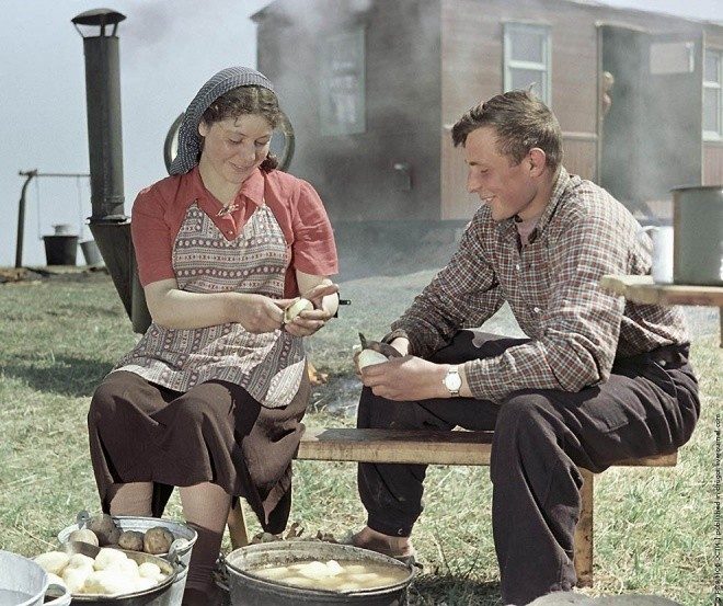 Целинники готовят обед у полевой кухни. Исаак Тункель, 1 мая 1955 года