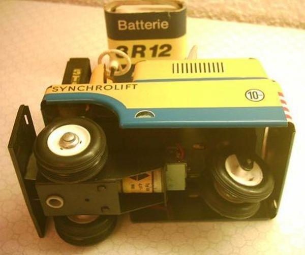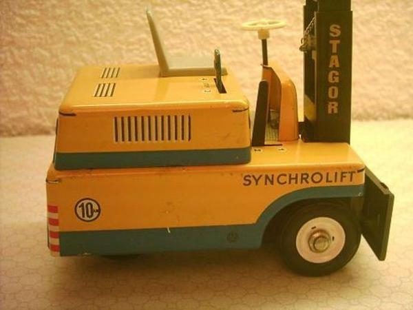 Типичная игрушка в стиле 60-х — корпус из штампованной окрашенной жести. Качество — высочайшее. Тот же универсальный мотор фирмы «Пико», резиновые шины, два задних спаренных колеса, коробка передач, в том числе и для действующей стрелы погрузчика, действующее рулевое управление. И в дополнение — набор металлических контейнеров.