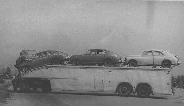 Габариты определяет государство. Тогда и автобус ЗиС-127 имел ширину 2,7 м и ездил без проблем. Потом уже наши подсели на европейские 2,5 метра. Тут ширина, возможно, 3,1 метра (ширина Москвичей той поры 1540 мм, стоят практически без зазора и без отступа от края полуприцепа.