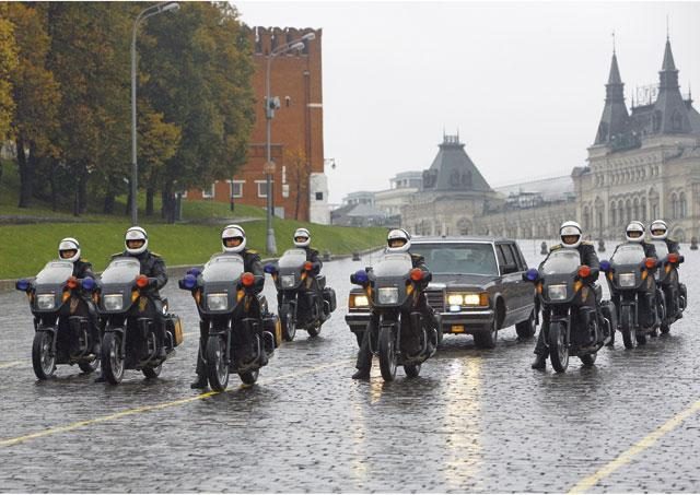 Кроме автомобилей — обычно пяти — обязательным атрибутом кортежей были мотоциклы, число которых доходило до 21. Их действия были отработаны идеально. Шли по трассе «свиньей» — в начале — три мотоцикла, далее — по одному рядом с каждым колесом машины и два с зелеными мигалками в хвосте.