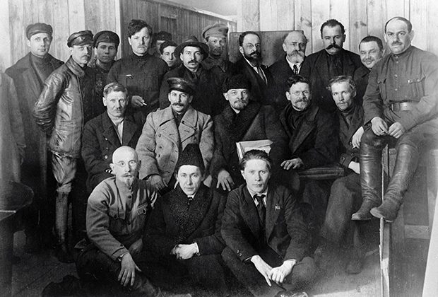 Иосиф Виссарионович Сталин, Владимир Ильич Ленин и Михаил Иванович Калинин (во втором ряду в центре слева направо) среди делегатов VIII съезда РКП (б). 1919 год