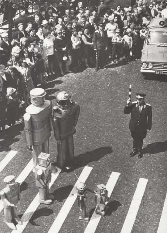 Советский регулировщик пропускает семью роботов.