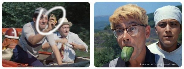 10. Кидают один огурец, а в рот Шурика прилетает уже другой… ещё и со специальной верёвочкой для выдёргивания