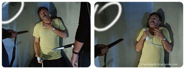 9. За время погони герой Вицина успевает не только перевязать галстук, но и снять и снова надеть свои подтяжки для их использования при метании огурцов