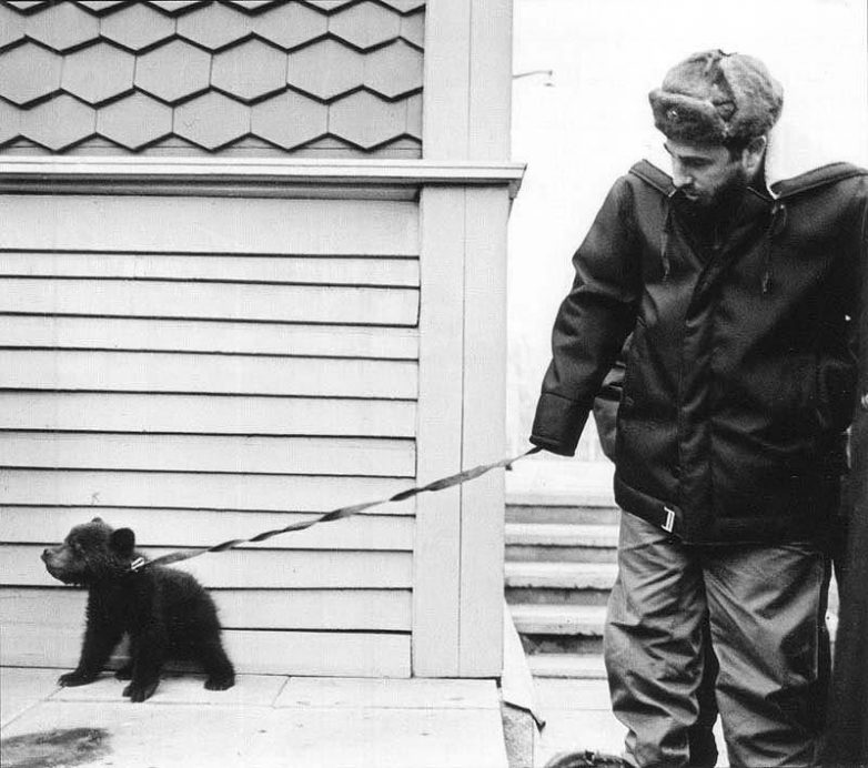 Фидель Кастро с медвежонком по имени Байкал, подаренным ему сибирскими геологами. Медвежонок отправился вместе с новым хозяином на Кубу, но, к сожалению, не смог адаптироваться к непривычному тропическому климату.
