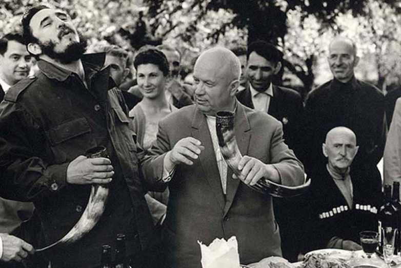 Горячий приём в Грузии — это на самом деле приём в Абхазии. В наше время это путать не нужно. Это местечко Лыхны в Абхазии. Обратите внимание на выражение лица местного старейшины в центре всех снимков. Дело в том, что после провозглашения здравицы Фидель не желая пить полный, как у всякого почётного гостя, рог, вылил вино на землю. Иногда простота — хуже воровства. Это настоящее оскорбление хозяев, и Хрущёву с окружением пришлось долго извиняться перед старейшиной и объяснять Фиделю недопустимость такого оскорбления. На последнем снимке видно, что до Фиделя наконец «дошло». Но извиняться он не стал, извинялись советские члены эскорта.