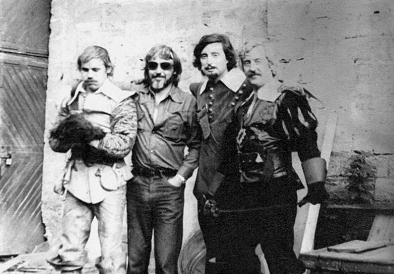 Ходюшин (дублирует Боярского при прыжке в окно на лошади), Юнгвальд-Хилькевич, Смехов, Кринский в перерыве съёмок драки в павильонах Красной голубятни и Таверны. Фото — Николая Ващилина. 1978 год