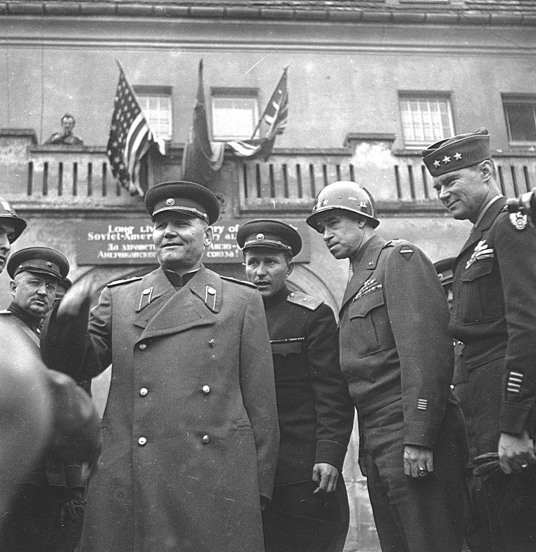 Встреча советского командующего 1-м Украинским фронтом маршала Ивана Степановича Конева с командующим 12-й армейской группой американских войск генералом Омаром Брэдли (Omar Bradley) в населенном пункте Лебуза в 40 км северо-восточнее города Торгау 5 мая 1945 года. Справа от генерала Брэдли стоит начальник штаба армейской группы генерал-лейтенант Аллен.