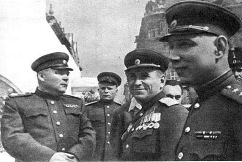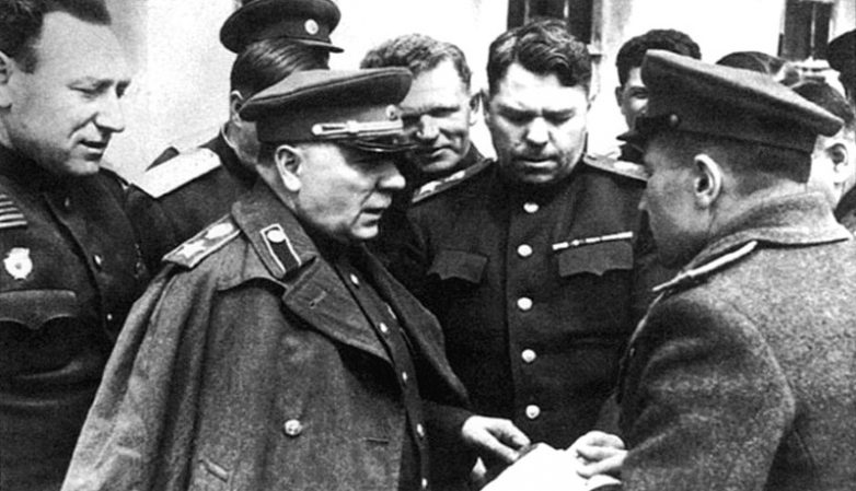 Стоит справа — представитель Верховного Главнокомандования Красной Армии командующий 1-м Белорусским фронтом Маршал Советского Союза Г.К. Жуков, стоит в центре с поднятой рукой — заместитель командующего 1-м Белорусским фронтом генерал армии В.Д. Соколовский.
