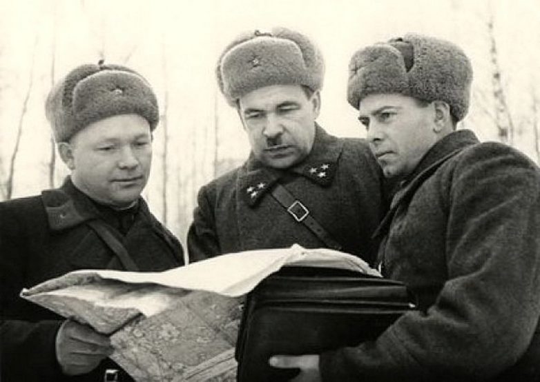 Кирилл Афанасьевич Мерецков (справа) с офицерами обсуждает план военных действий.