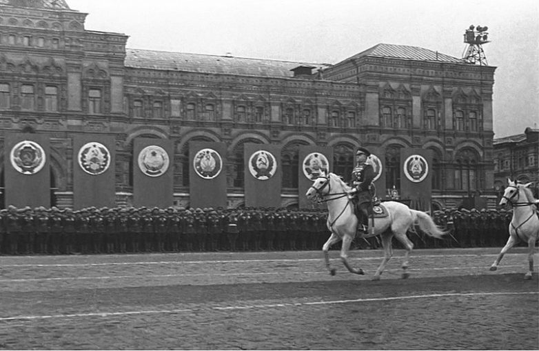 Парад Победы. Заместитель Верховного Главнокомандующего Маршал Советского Союза Г.К.Жуков принимает парад войск Действующей армии, Военно-Морского Флота и Московского гарнизона в ознаменование победы над Германией в Великой Отечественной войне.