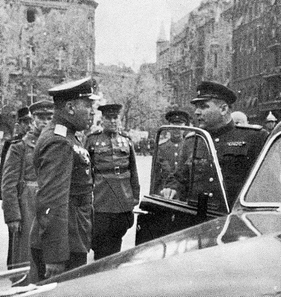 Командующий 2-м Украинским фронтом Р.Я.Малиновский (первый слева), командир 4-го гвардейского механизированного корпуса В.И.Жданов (в центре) и член Военного совета фронта А.Н.Тевченков (крайний справа) на открытии памятника советским воинам в Будапе