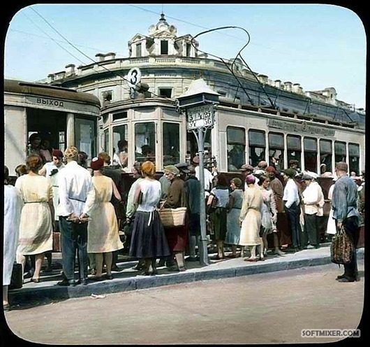 Народ выглядит ужасно, и лица в основном деревенские — к этому времени в Москву уже переехала половина колхозников Московской области. В результате чего население Москвы с 1917 года к 1935-му выросло в 3,5 раза.