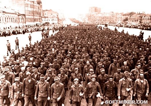А насчёт поливальных машин, то здесь не только символический аспект. В Москве была жара +30, а немцев накануне накормили жирной кашей с салом и у многих расстроился желудок. Участники этого действа вспоминают, что многие просто обс**лись прямо на ходу.