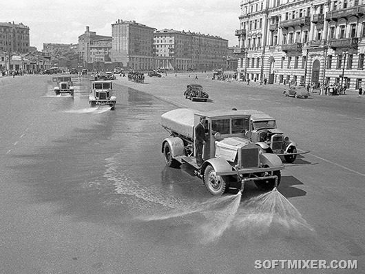 На протяжении следования колонны за ними двигались поливальные машины, который омывали асфальт. Вообще, появление поливальных машин на улицах города было достаточно редким явлением в военное время. До сих пор существуют различные версии того, зачем они понадобились. Весьма популярная версия о том, что это требовалось для дезинфекции, дабы предотвратить возможное распространение заболеваний.