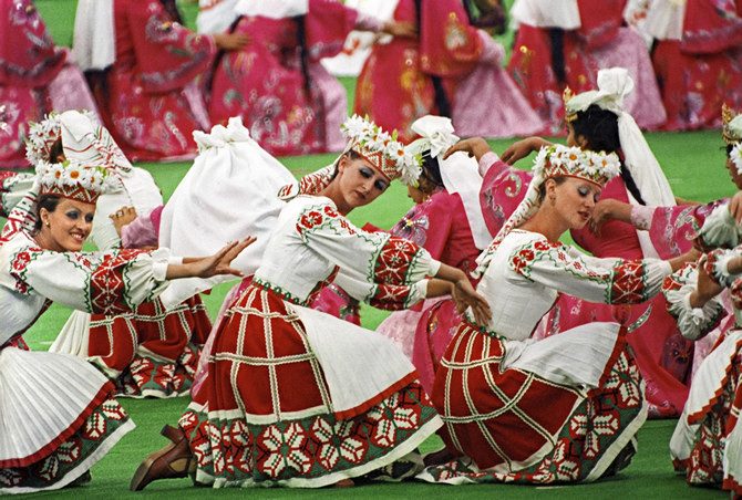 Свет то приглушался, то вспыхивал вновь, действие продолжалось! Вскоре стало ясно: спортсмены ушли, чтобы вернуться! Зрители, только что наблюдавшие за выступлениями танцевальных коллективов, увидели, как сильнейшие акробаты мира, Европы, СССР присоединились к спортсменкам, дружно выполняющим упражнения с лентой-шарфом. Те, кто присутствовал на закрытии, свидетельствуют: невозможно забыть, как на арене вырос и расцвел чудесный цветок из гибких, ладных тел! В это время в пространстве под трибунами томился Мишка. Огромную, готовую к «взлету» куклу пришлось сдувать и надувать вновь: она никак не проходила по габаритам желоба, направляющего ее на стадион. Пока решался технический вопрос, шоу продолжалось. Поле превратилось в огромную площадь для русских народных гуляний. Кружился хоровод, звучали залихватские гармошки, балалайки. Не обошлось без огромных матрешек. Их вывезли на грузовиках. Словно в сказке вырастали березки, выплывали белые лебеди – художественный фон создавали на трибунах пять тысяч человек, вооруженные цветными планшетами. Сменяющихся картин насчитывалось более ста пятидесяти! Завидная слаженность действий! Сбоев не наблюдалось. Наконец появился Мишка. Некоторое время он плыл по стадиону, удерживаемый группой сопровождения.