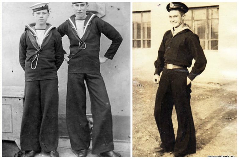 Брюки шились трубой — клеш был «от бедра» и ширинки на них не было: застежка находилась сбоку, чтобы свалившись за борт, моряк мог быстро скинуть мешающие ему вещи.