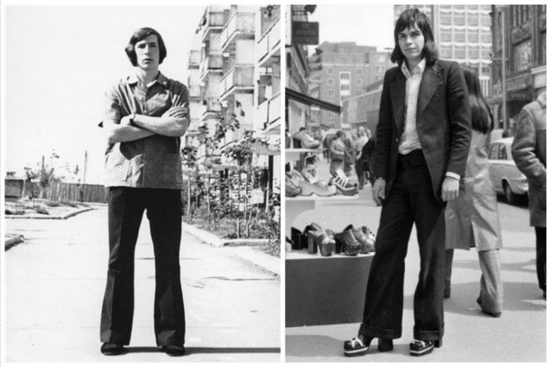 Здесь же появились и некие стандарты — если ширина брюк под кленом составляла 21 сантиметр, то внизу, у щиколотки — 23. Все это дополнялось цветастой рубашкой, туфлями на платформе и тесёмкой для длинных волос.