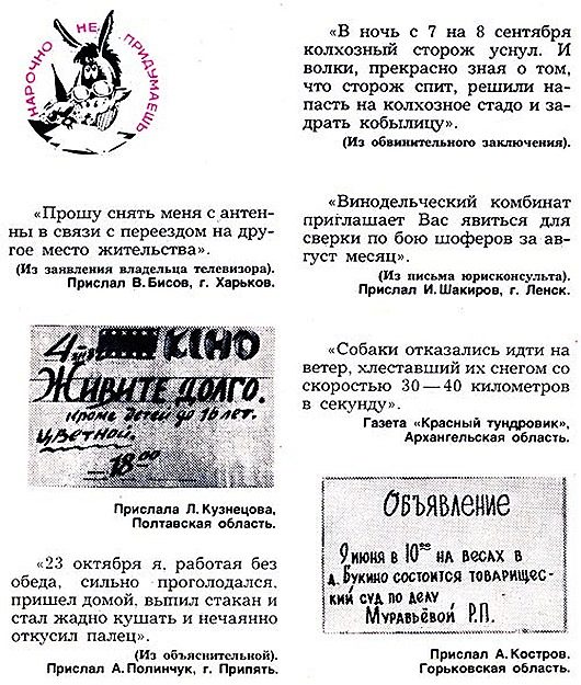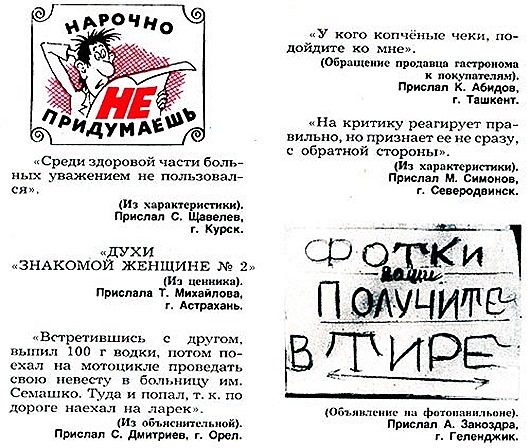 В советском журнале «Крокодил» самой популярной и весёлой рубрикой была «Нарочно не придумаешь». Её ведущий Николай Монахов частенько представлял образцы «народного творчества» и в телепередаче «Вокруг смеха». С приходом «демократии» ко всенародно любимому журналу пришли трудные времена…