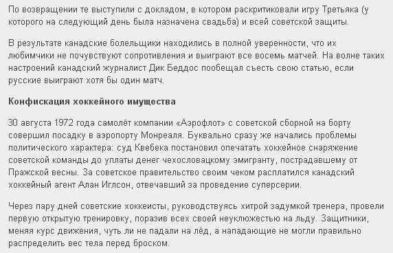 Да, перед русскими хоккеистами я должен снять шляпу. Я не знаю, каким образом они потерпели это поражение. Я спрашиваю себя: «Как русские могли проиграть, когда они катаются не хуже нас, так же принимают и передают шайбу, а как единая команда играют даже лучше нас и подготовлены лучше?»( Гарри Синден, «Хоккейные окровения»
