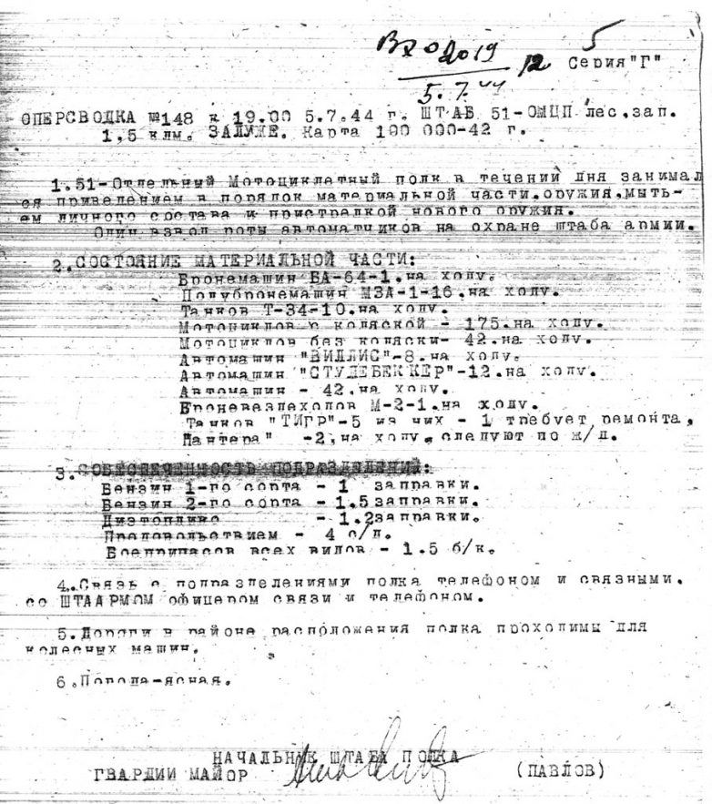 Состояние матчасти 51 ОМЦП на 5 июля 1944 года. Наиболее массово «Тигры» использовались именно в этой части
