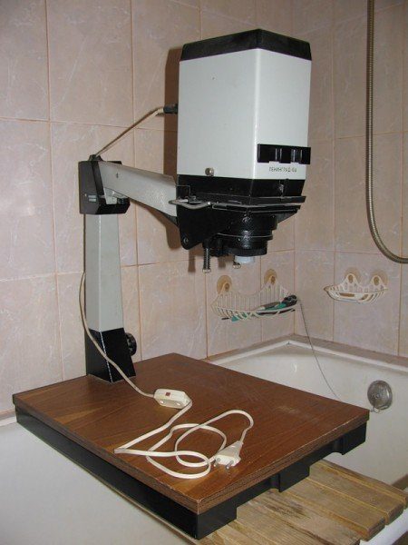 Желательно научится находиться там в темноте, чтоб все движения были интуитивными и простыми. Готовим нашу импровизированную лабораторию заранее. Сначала подключаем к сети наш фотоувеличитель (это именно тот инструмент, который позволит получить размер снимка, который вы хотите (ограничено возможностями фотоувеличителя), с маленького 35мм негатива.