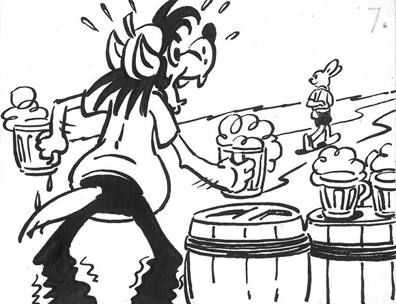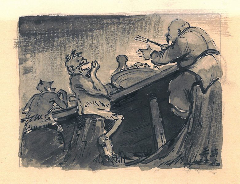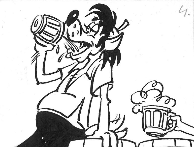 Работа художника Светозара РусаковаПозже отец нарисовал этого человека по памяти. Все считают, что Волка Светозар Кузьмич рисовал с актера Анатолия Папанова. На самом деле нет – именно этот хам из очереди и стал прообразом героя мультфильма. Даже некоторые позы похожи: можно сравнить то, как отец нарисовал этого человека, и рисунок Волка, одобренный худсоветом в качестве «эталона» для мультфильма.