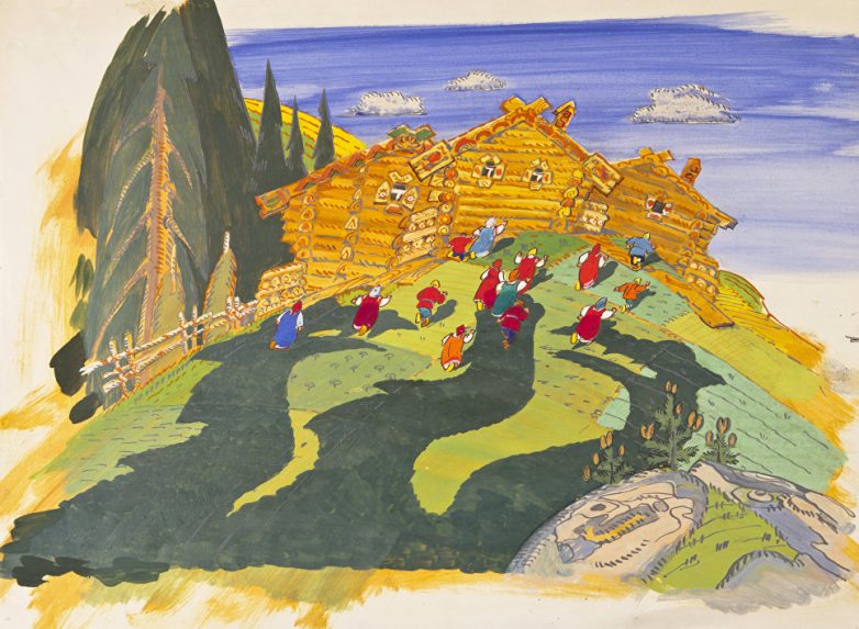 Эскиз к фильму «Пропавшая грамота»Его первым фильмом на киностудии стал «Буратино» Ивана Иванова-Вано, для которого Русаков создал все фоны. Персонажей рисовал замечательный художник Петр Репкин. Чтобы картинка была максимально приближена к итальянской, отца отправили в командировку в Ялту – считалось, что именно крымские пейзажи больше всего похожи на итальянские.