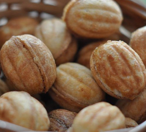 Вот, что действительно вызывает приступ ностальгии, так это печенье «орешки». Они готовились из песочного теста, и наполнялись вареным сгущенным молоком. Такое угощение не только покупали, но и готовили своими руками.