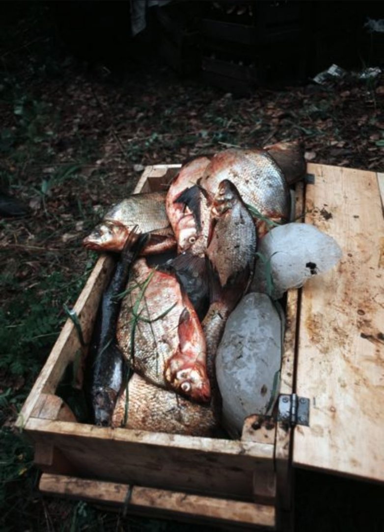 Свежепойманная рыба на льду в деревянной коробке