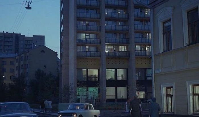 10. Кадр из фильма «Служебный роман». Здесь жила главная героиня Людмила Прокофьевна Калугина. Калугина жила в многоэтажке, но в хорошем районе. Дом 43 на Большой Никитской.