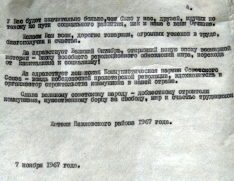 Кроме добрых пожеланий потомкам и описания достижений тружеников социалистического Павловского района с указанием фамилий Передовиков сельского хозяйства, производства и сферы социалистического обслуживания. Тем и дороги эти сведения в том Послании, что сегодня через 50 лет дети, внуки и правнуки, упомянутых в нём, могут прочитать о своих родственниках, которые вершили славную историю своего села, колхоза, района и страны СССР.