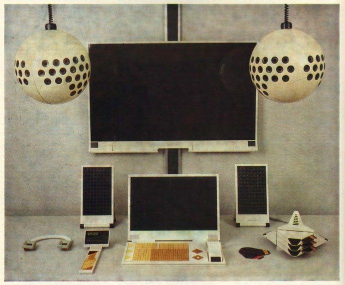 «Здесь происходит просмотр фильмов, видеопрограмм, телепередач, произведений искусства, других изображений и фонограмм, коллективные компьютерные игры, сюда же могут выводиться фрагменты семейного альбома. Семья может устраивать дружеские телемосты или деловые встречи. Дополнительная информация (время, погода, справки, другие каналы и т. п.) может предъявляться на вредном кадре», — мечтали в умирающем СССР. В этом описании, взятом из журнала «Техническая эстетика» за 1987 год, сегодня легко узнаются онлайн-игры, мессенджеры а-ля Skype, умные телевизоры и даже электронные фоторамки.