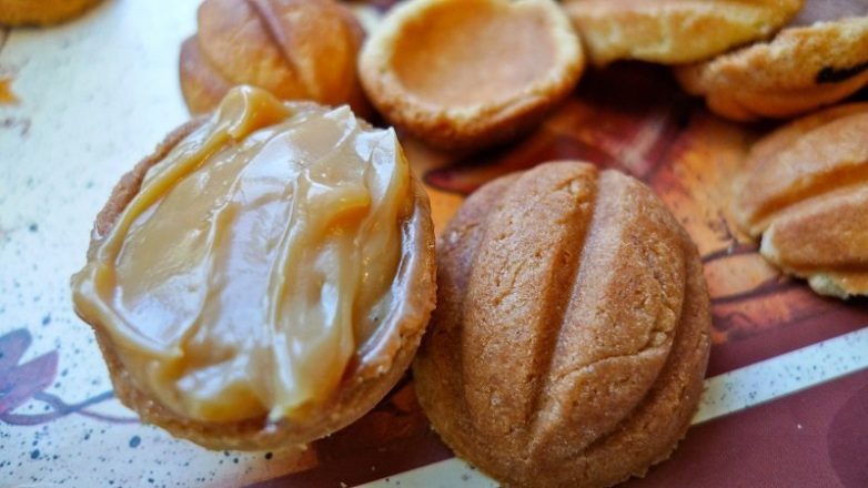 Признаться честно, форма для выпекания таких орешков у меня есть до сих пор. После всех перипетий с банкой сгущенки мама замешивала специальное тесто и доводила его до готовности в форме. Моим заданием было начинить орешки. Конечно же, полбанки сгущенки бесследно пропадало в процессе.