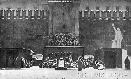 А в конце января 1924 года, на месте кирпичной трибуны, по проекту Щусева был построен временный деревянный мавзолей, в который 27 января поместили гроб с Лениным. Надо заметить, что скульптуру «Рабочего» (скульптор Ф. Лехт) оставили на месте.