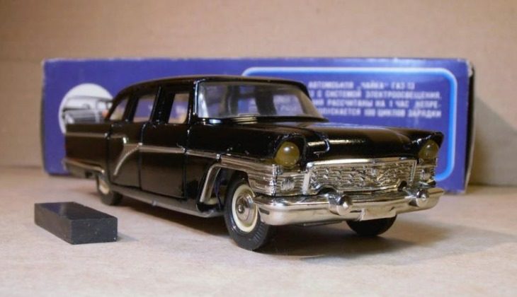Электрифицированный вариант «Чайки» ГАЗ-13. Две плоские батарейки размещены в багажнике Также достойна внимания ВАЗ-2121 «Нива» под номером А20, появившаяся в 1980 году. У нее было не только детализированное днище и открывающиеся двери, капот и багажник на манер «Волги», но и работающая подвеска в компании с поворачивающимися колесами. То есть именно эта копия больше остальных походила на автомобиль. Ее любят и ценят до сих пор, а за образцы ранних серий придется выложить около 20 тысяч рублей.