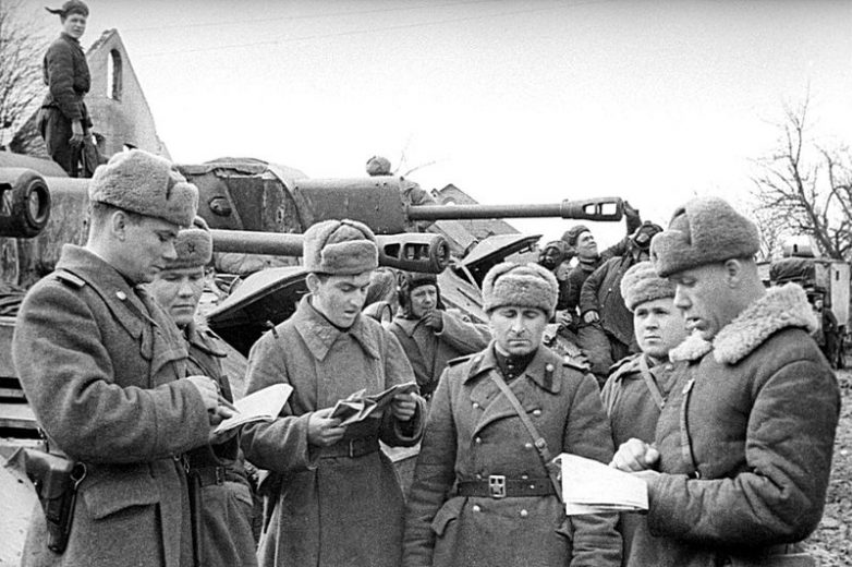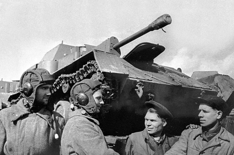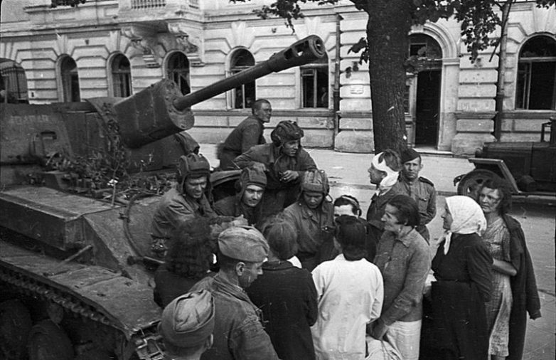 Экипаж советской САУ СУ-76М и пехотинцы общаются с жителями освобожденного советского города.