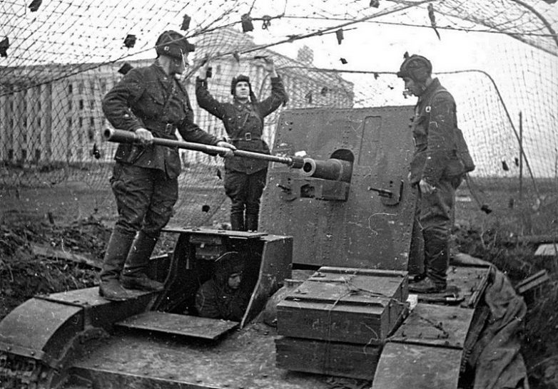 Легкая советская САУ СУ-26 на позиции рядом с Домом Советов в Ленинграде. октябрь 1941