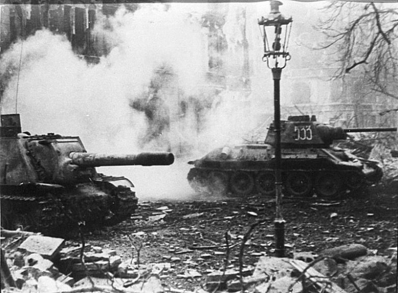 Советская САУ ИСУ-152 и огнеметный танк ОТ-34-76 в бою на улице Бреслау (Breslau; ныне Вроцлав (Wrocław) в составе Польши). 1945 г.