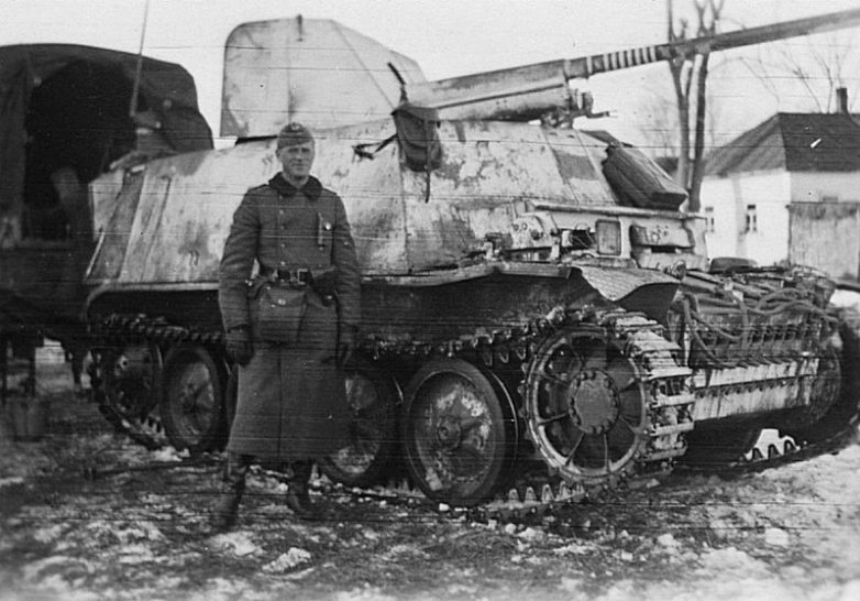 Немецкий офицер рядом с легкой противотанковой самоходной-артиллерийской установкой «Мардер II» (7.62-cm-Pak ® auf Fahrgestell Pz.Kpfw.II (Sf), Sd Kfz132 (Marder II)) на Восточном фронте.