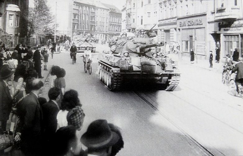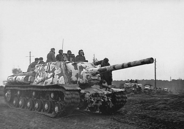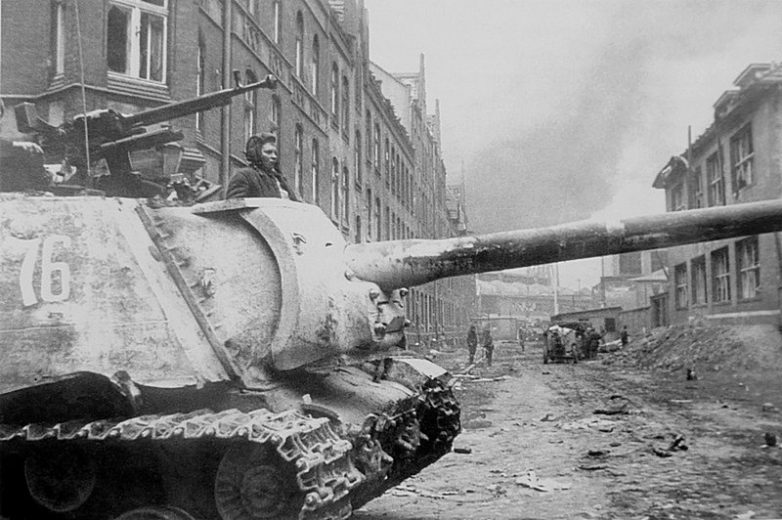Советская САУ ИСУ-122 с установленным на броневой рубке зенитным 12,7-мм пулеметом ДШК на перекрестке улиц Штифтсвинкель (Stiftswinkel) и Ам Хольцраум (Am Holzraum) в Данцигe (ныне Гданьск в Польше). Сейчас улицы называются ul. Rоbotniсza и ul. Stefana Jaraсza.