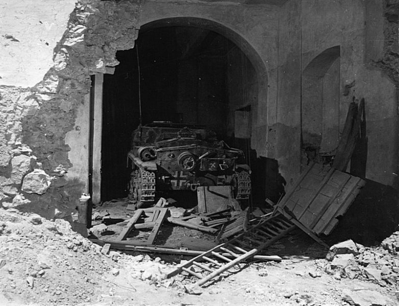 Немецкая САУ StuG 40 в холле разрушенного союзниками отеля «Continental» в итальянском городе Кассино (Cassino). Место съемки: Кассино, Италия. Время съемки: 21.05.1944
