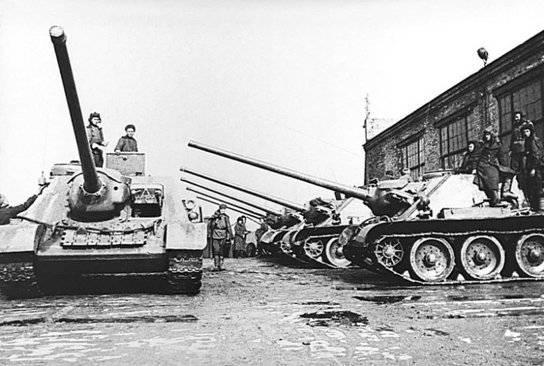 Советские самоходные установки СУ-100 во дворе завода «Уралмаш» перед отправкой на фронт.