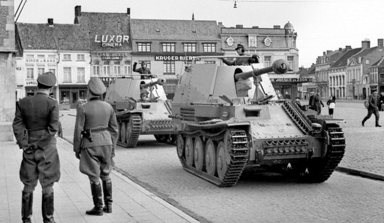Взвод САУ Marder III Ausf. M 19-го батальона истребителей танков в составе 19-й авиа-полевой дивизии в ходе учений на рыночной площади в Экло. Крайний слева — командир батальона истребителей танков гауптман Гельмут Шмидт